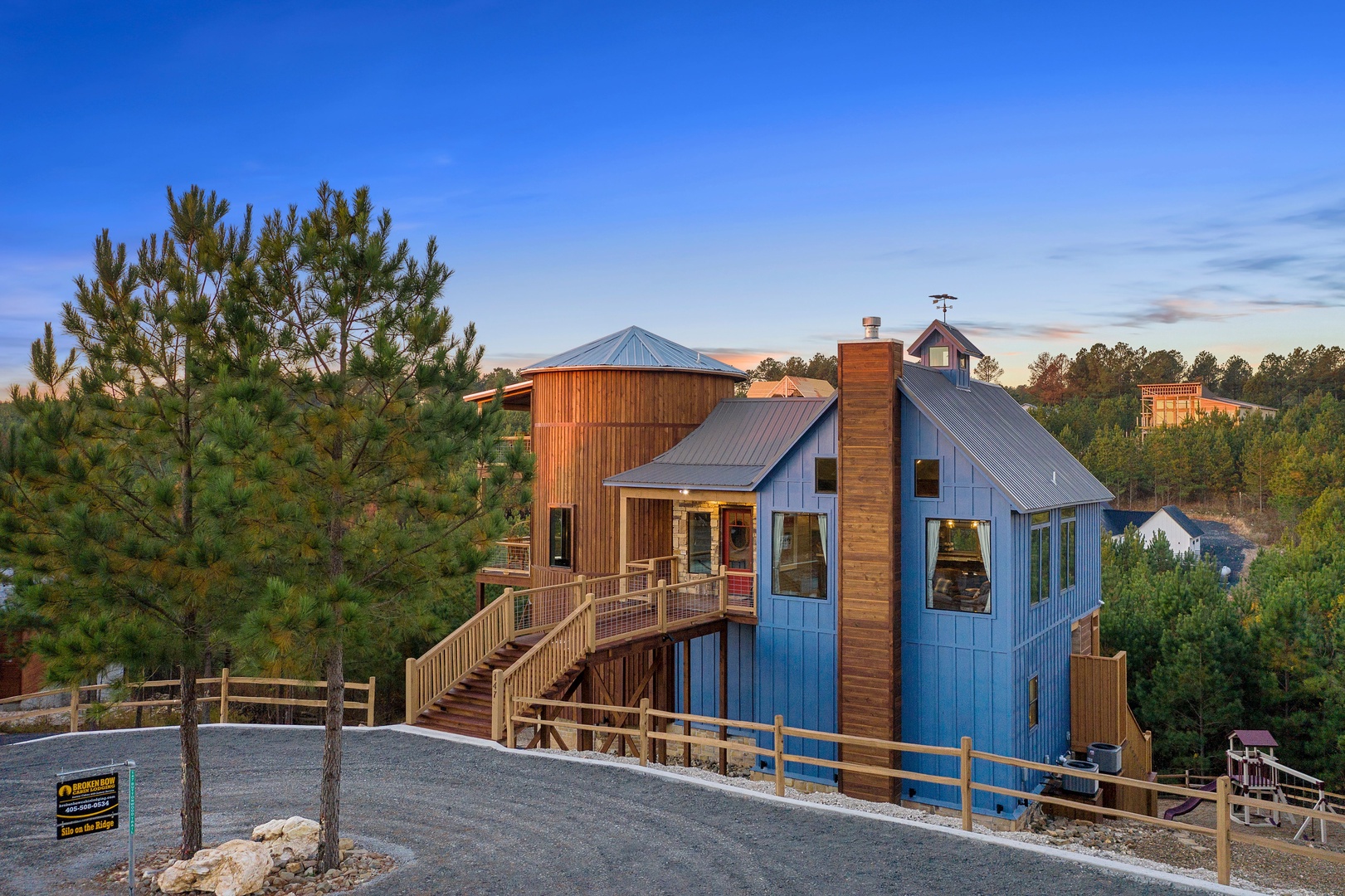 Home is a 4 bed 30 bath property. This large grain bin has been converted into a rustic two story getaway using reclaimed barn wood and many antiques.